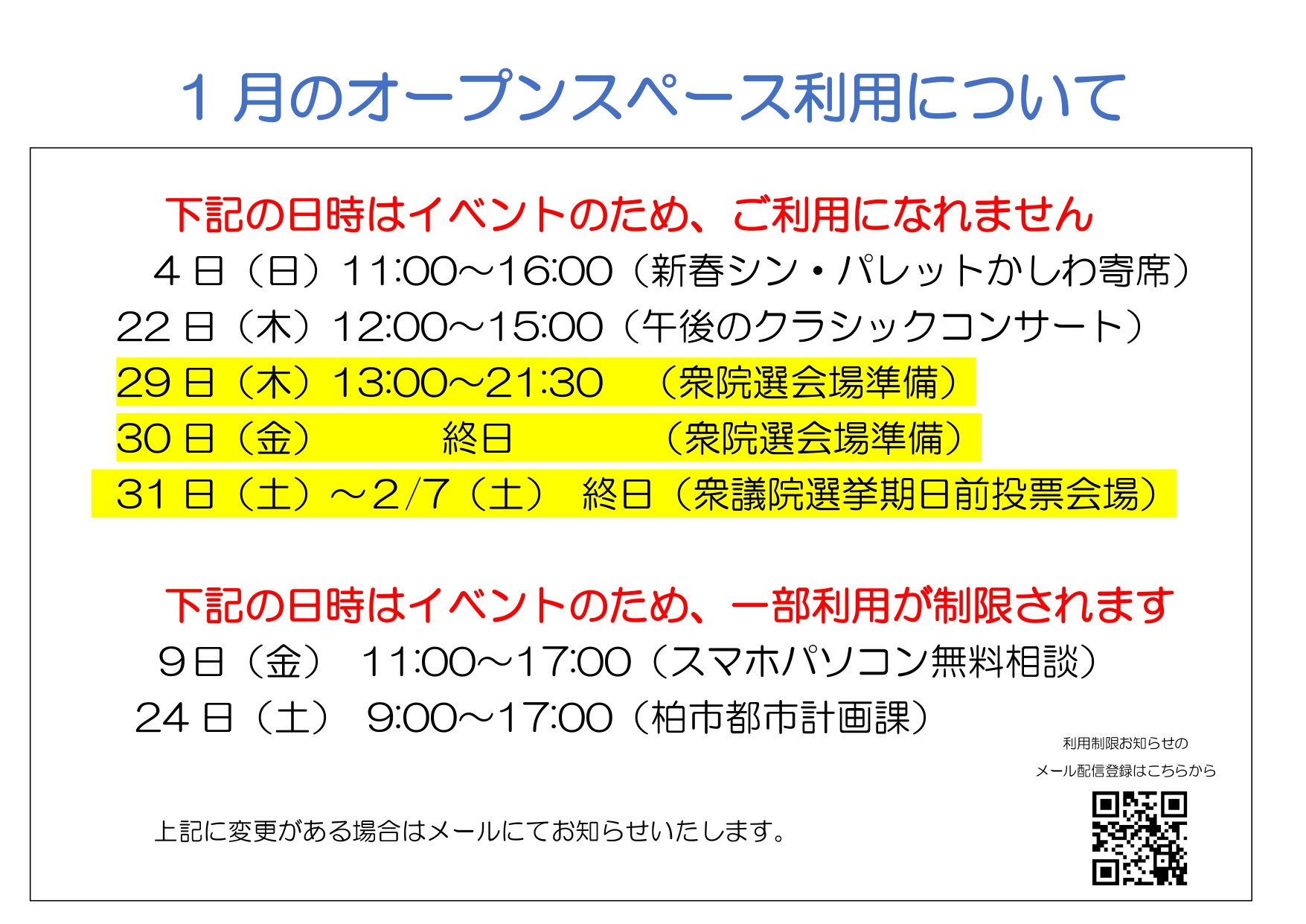 【1月】オープンスペースの利用制限について【変更あり】
