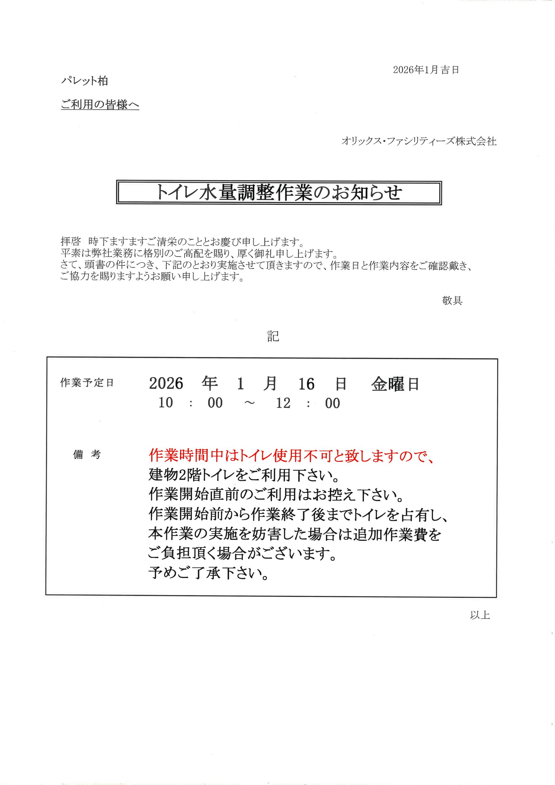 下記期間中、トイレの使用ができませんのでご注意ください。