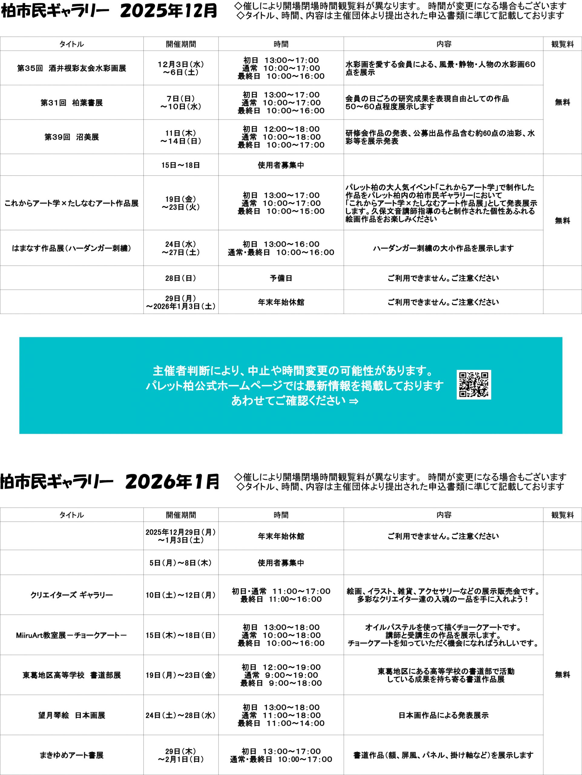 柏市民ギャラリー12月1月の催しです。開催の有無を必ずご確認ください。