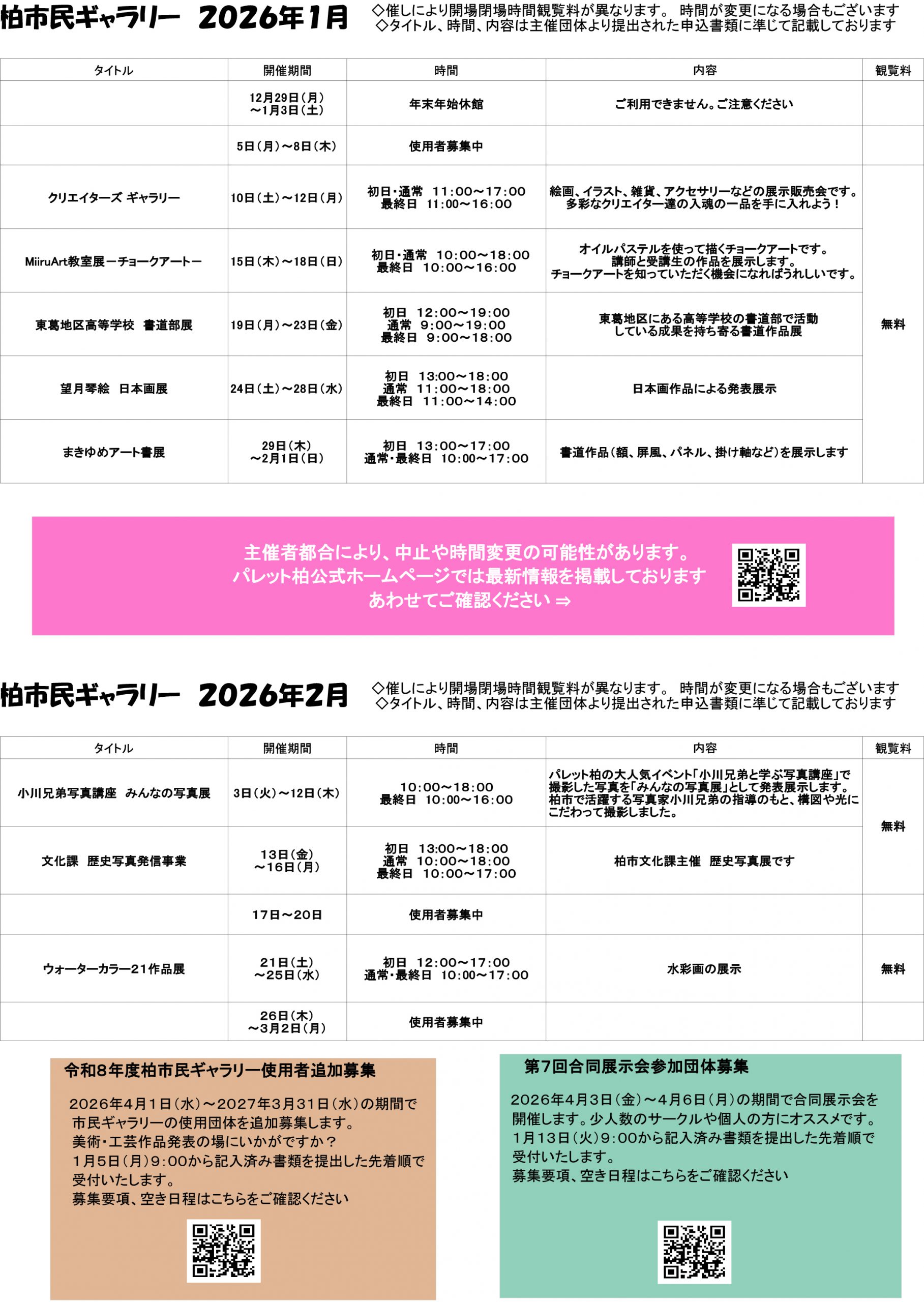 柏市民ギャラリー1月2月の催しです。開催の有無を必ずご確認ください。