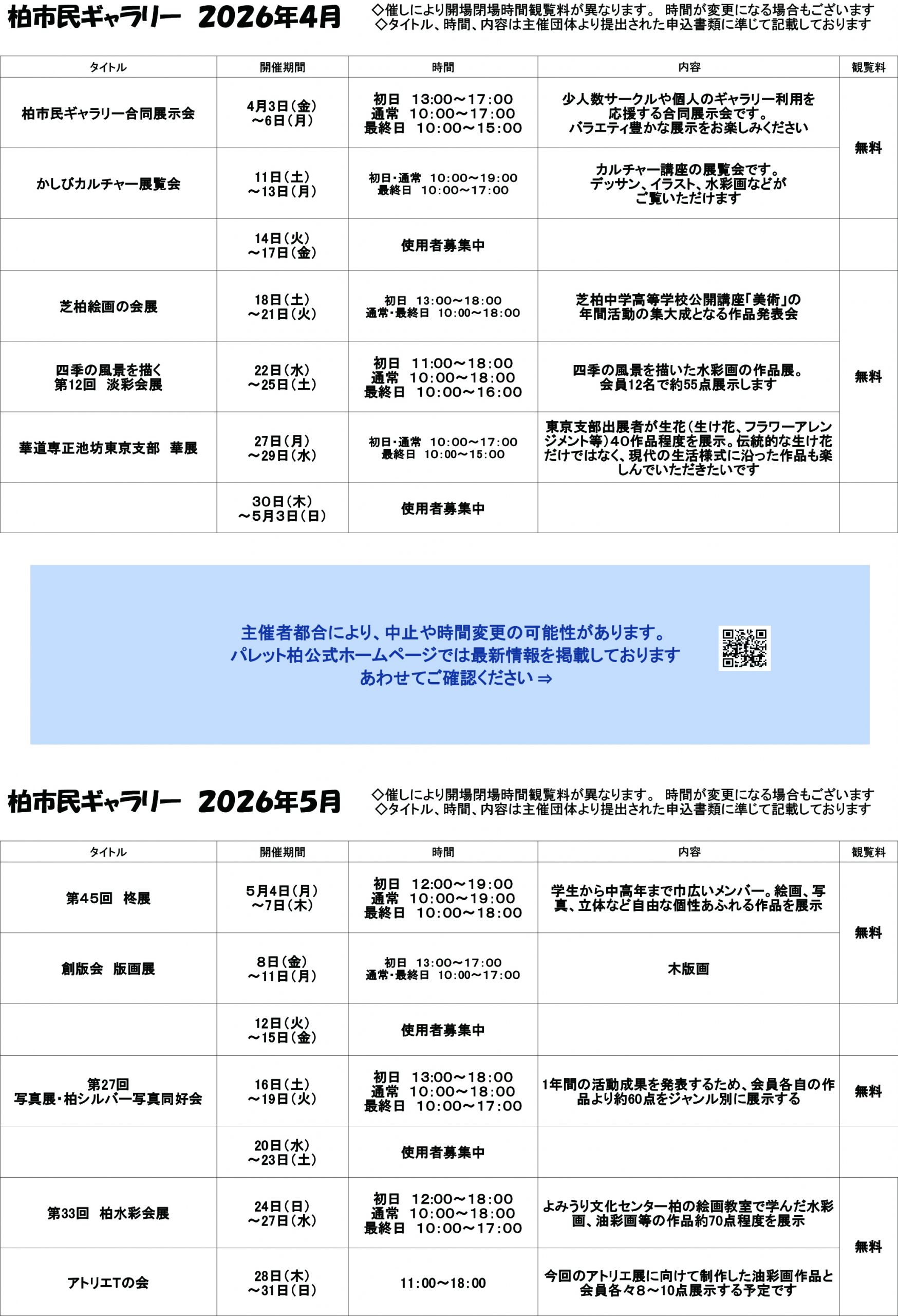 〇広報かしわ4月号掲載分 ギャラリー予定表